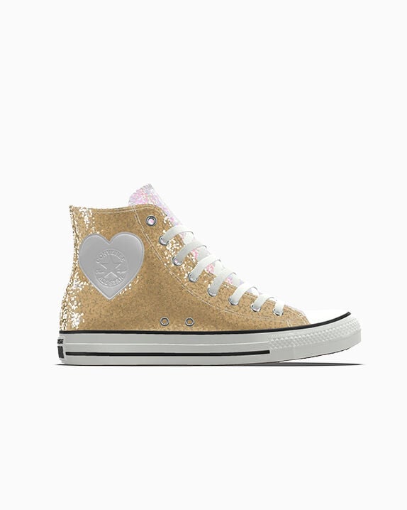 Looking for a pair of gold shoes that's uniquely you? Our custom glitter options help you create the footwear you've been dreaming of. First, choose your canvas from our candy-store selection of sparkles. Then, go to town with every element of the design. Add contrast panels for vibrant clashes or luscious coordination. Go for stitched seams that blend in or stand out. You'll even find a treasure trove of Chuck Taylor All Star patches to reflect your vibe. Treat yourself, or surprise your best human with a pair of Converse trainers that says 'I get you' like nothing else.